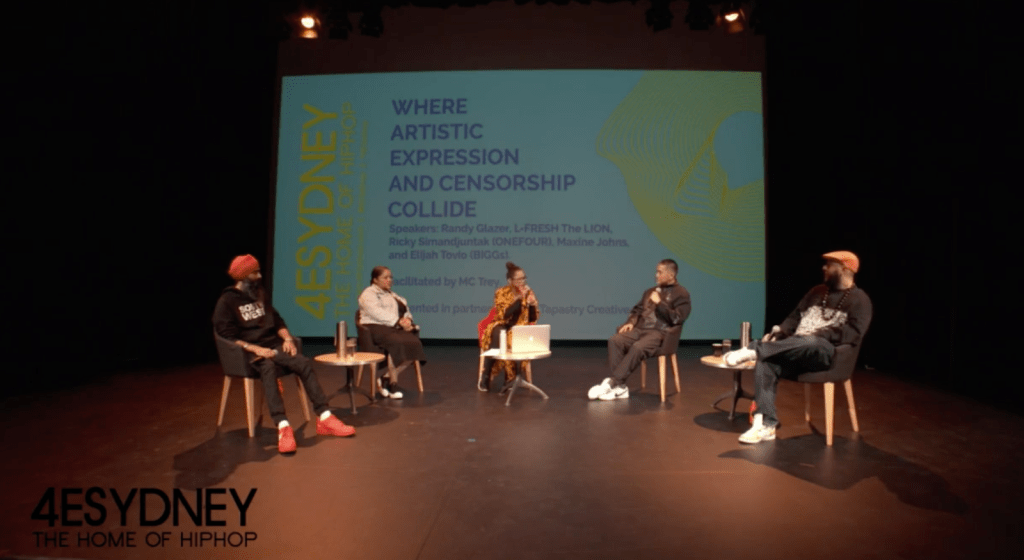 4ESYDNEY’s recent panel When Creative Expression and Censorship Collide, brought together some of Sydney’s notable music industry personalities, namely Randy Glazer, L-FRESH The LION, Ricky Simandjuntak, and Maxine Johns. Mediated by MC Trey, local outfit ONEFOUR was used as a base for a discussion that explored the impact of censorship on the Western Sydney music scene and what work remains to be done.
